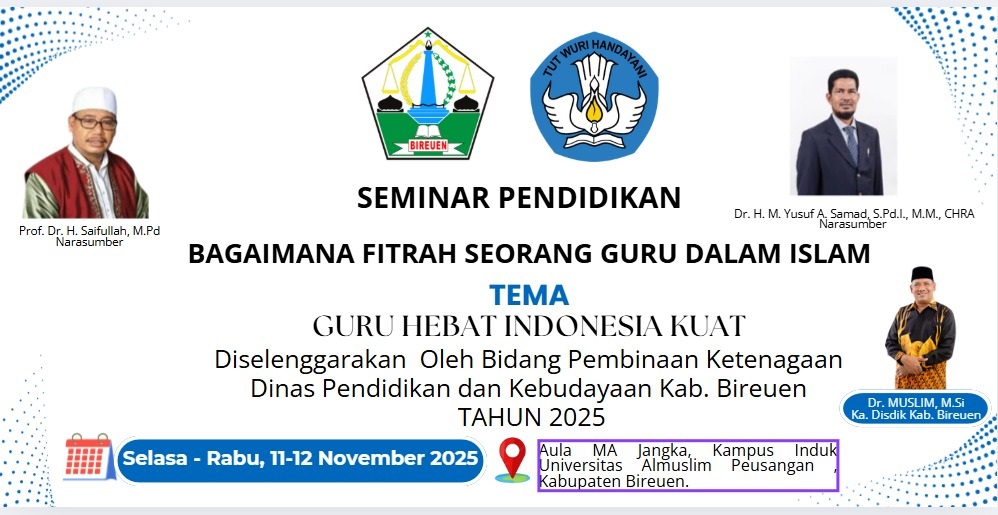 Acara yang dilaksanakan di Aula M. A. Jangka Universitas Almuslim Matangglumpangdua Bireuen tersebut, di ikuti lebih 100 peserta yang mayoritas guru-guru di Bireuen. Menampilkan dua pakar sebagai narasumber, masing-masing ahli manajemen SDM Pendidikan Kampus Universitas Islam Kebangsaan Indonesia (UNIKI) Bireuen, Dr. H. M. Yusuf A. Samad dan Abiya Prof. Dr. H. Saifullah, S.Ag, M.Pd -Ketua Senat Universitas Islam Aceh yang juga Pimpinan Yayasan Pesantren Ummulqura Antarabangsa.